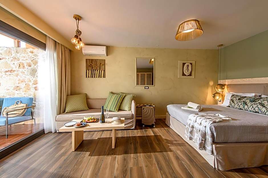 This suite features a dining area, electric kettle and sofa. This suite is built based on the old traditional Cretan house style, with rustic elements and respect to the Cretan architecture.